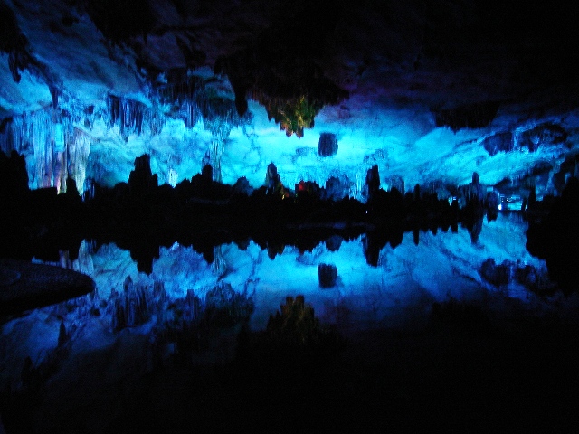 芦笛岩 芦笛岩は鐘乳洞窟で、「大自然の芸術宮殿」と呼ばれています。(芦笛岩洞内、経路曲折、石筍、石花、千姿百態。特別是水晶宮寛広高大的空間、令人賛不絶口)。 水晶宮↓ ↓金箍棒、給孫悟空拿走了一根、還留下了一根。